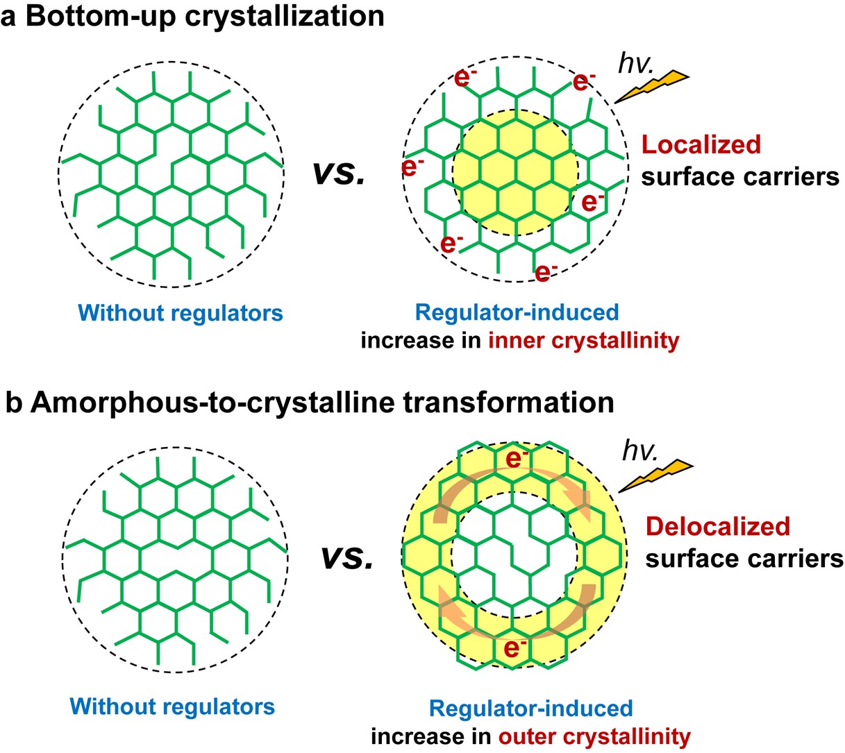 该研究改变了分子工程设计催化剂的思路,另辟蹊径,通过表面结晶调控实现了有机光催化剂的性能提升。区域结晶策略不仅为COF的微观结构调控提供了方法,其揭示的表面电子特性与催化活性关联机制,对开发高效太阳能转化材料具有指导意义。这种晶态转化方法为调控有机材料表面性质具有一定的普适性,有望推动光催化领域的进一步发展。