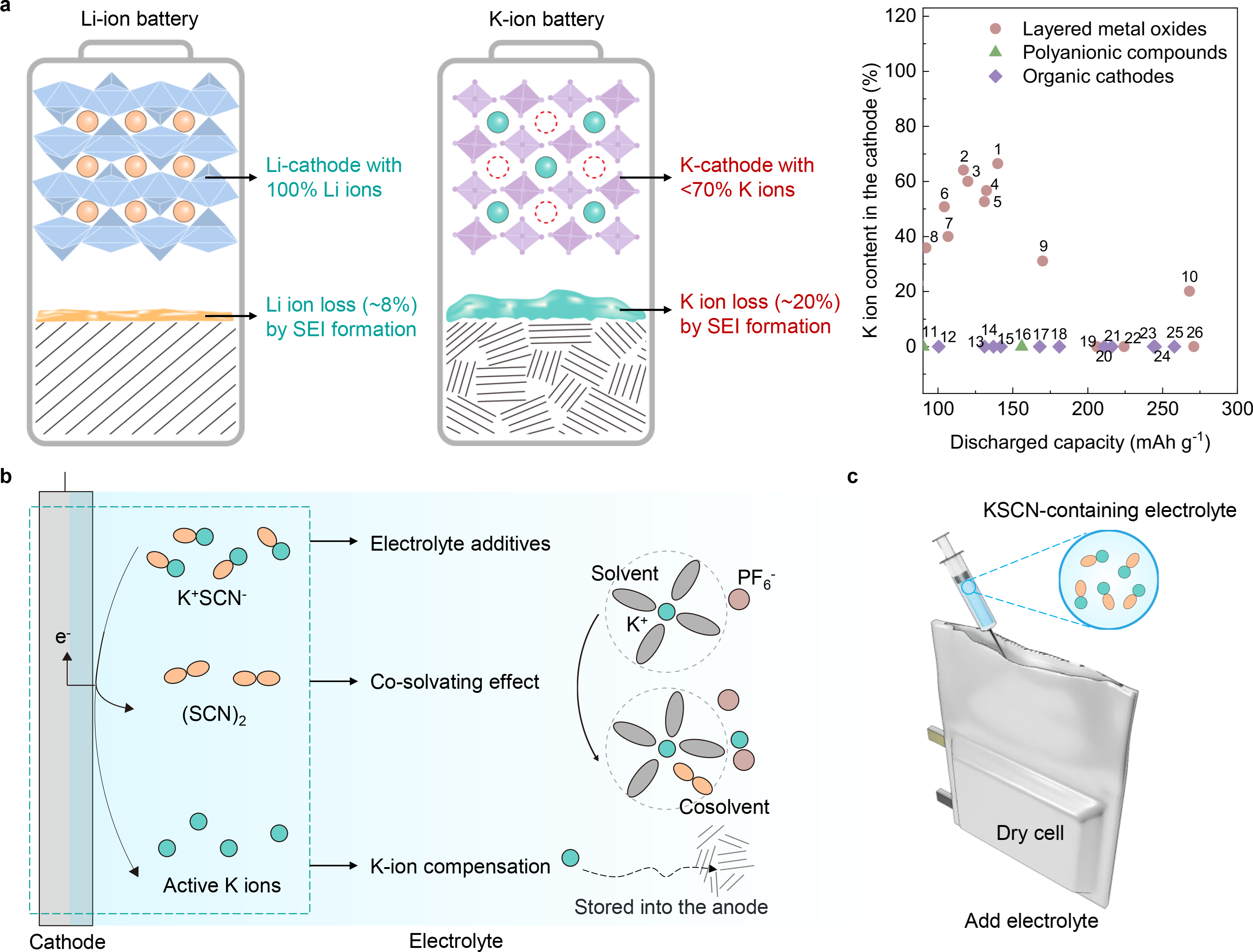 钾离子电池因其资源丰富、成本低廉和高能量密度等优势,被认为是下一代储能技术的有力候选者。然而,作为唯一的钾源,其绝大多数正极材料缺乏钾离子,并且负极在形成SEI过程中具有较大的不可逆容量损失,这使得钾离子电池面临活性离子匮乏的巨大挑战,严重限制了其商业化应用。