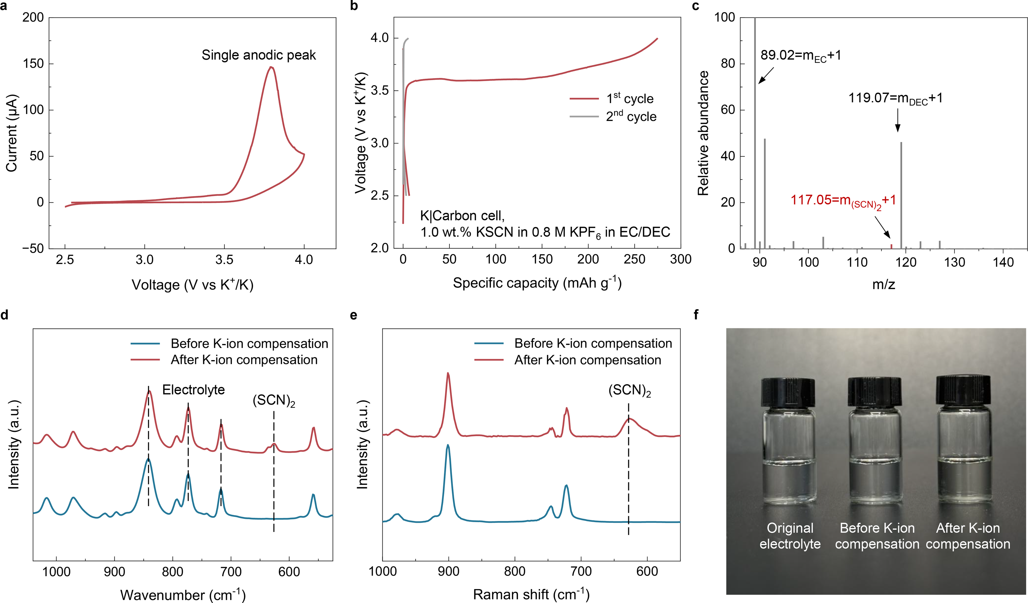 为了获得满足可溶于电解液、液态分解产物、电压窗口匹配、不可逆分解等条件的理想补钾剂,团队采用活性中心和侧基相结合的化学信息学设计原则,使用非监督学习成功筛选出硫氰化钾(KSCN)。实验结果表明,KSCN可溶于不同的电解液体系中,在3.6 V发生不可逆分解,释放出活性钾离子,同时形成电解液共溶剂(SCN)2,表现出275 mAh g-1的比容量,具备良好的倍率性能和热稳定性。
