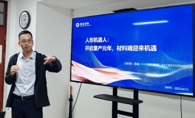 紧接着,陈屹分析师进行分享,他的分享主题是“人形机器人:开启量产元年,材料端迎来机遇”。首先他以人工结构蛋白质为例,从效率、成本和可信度方面进行分析,他说AI的出现是一项重大的技术革命,未来AI将成为重要的产业趋势,密切影响化工行业的发展。随后又介绍了人形机器人产业化的现状。