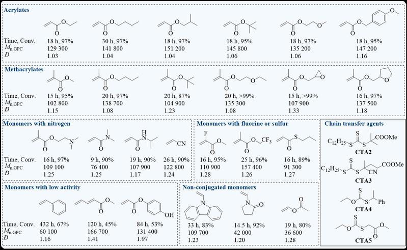 图2.  有机硼光催化的内层电子转移-可控自由基聚合的适用单体和聚合结果