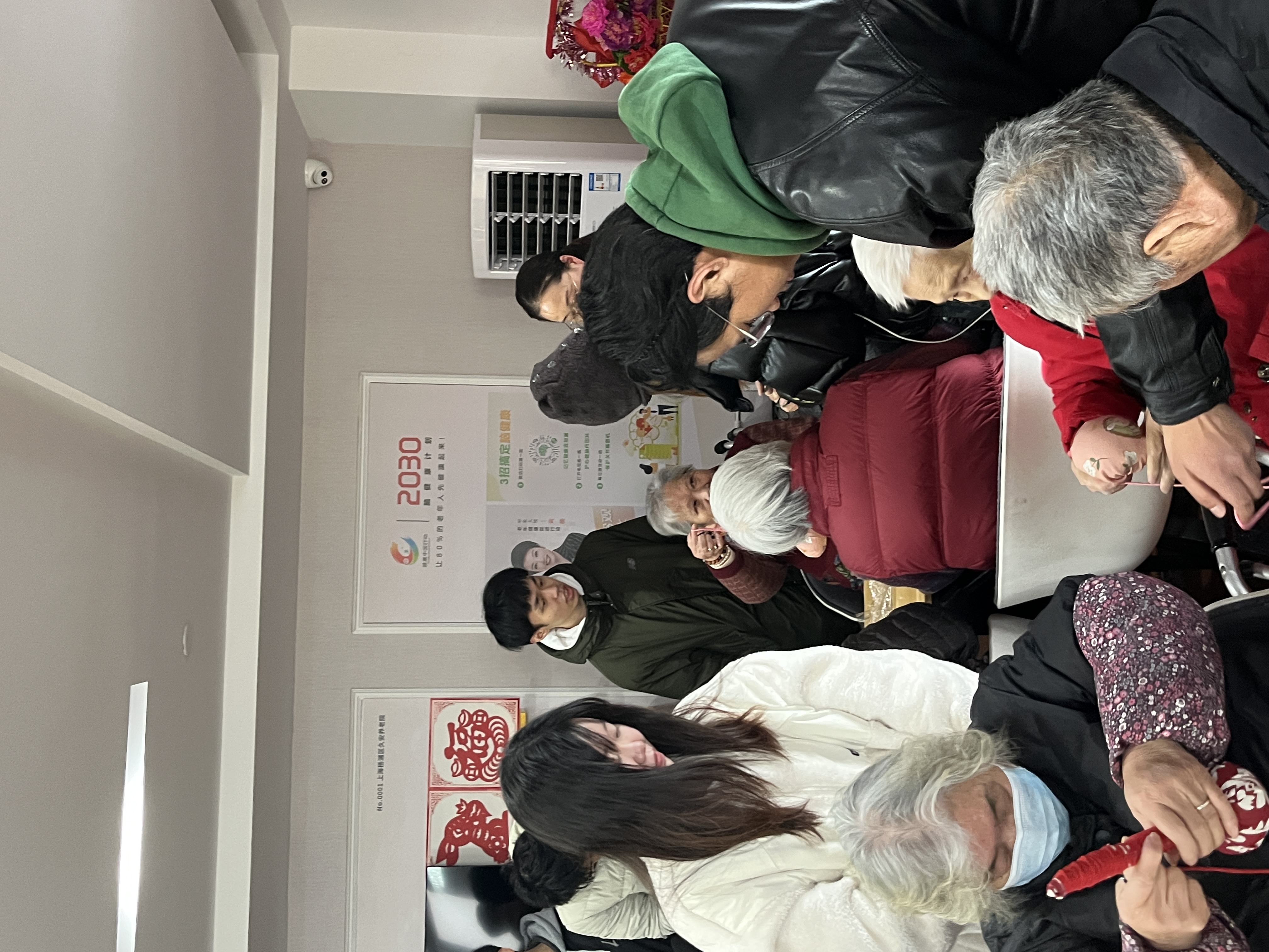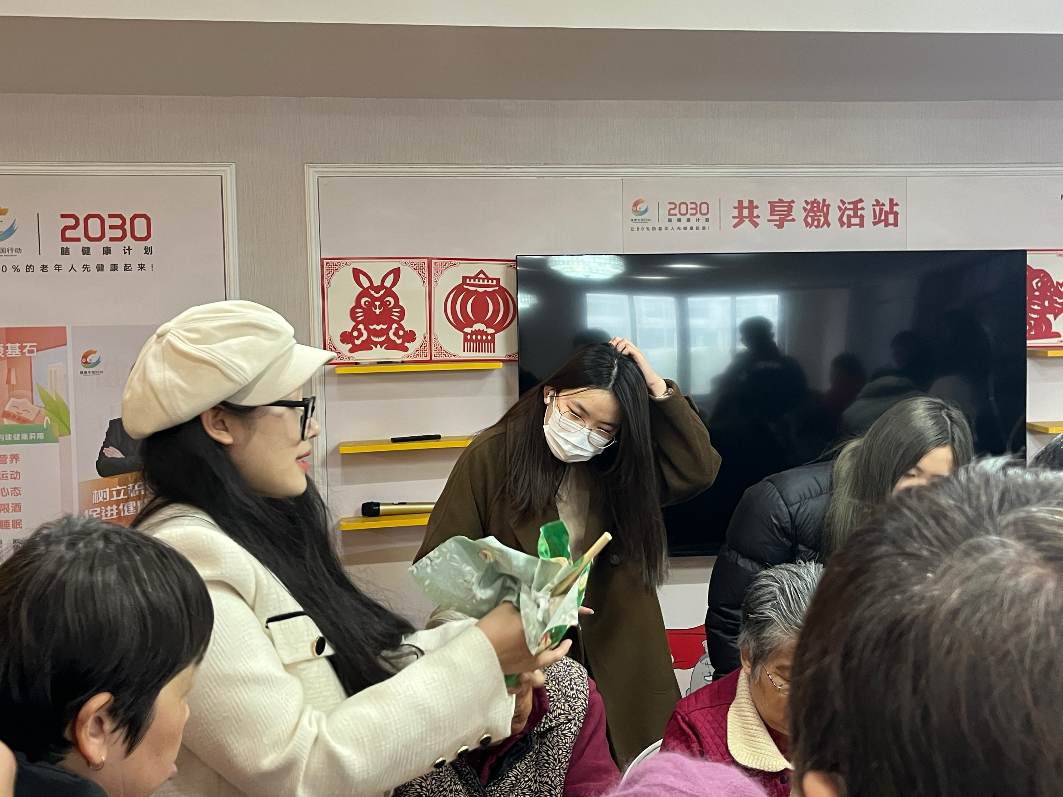 活动进入第三个环节,由衣芳慧同学为老人们讲解“艾草锤”的制作步骤。爷爷奶奶在各位志愿者们的指导下,开始尝试制作手工“艾草锤”。老人们认真跟随讲解的步骤动手操作,与志愿者一起动手指,动脑筋,现场气氛活跃。在志愿者的帮助下“艾草锤”完成,老人们纷纷迫不及待地展示和使用了他们的作品,每个人的脸上都洋溢着幸福的笑容。同学们的陪伴给老人们生活送去了欢乐与温暖。