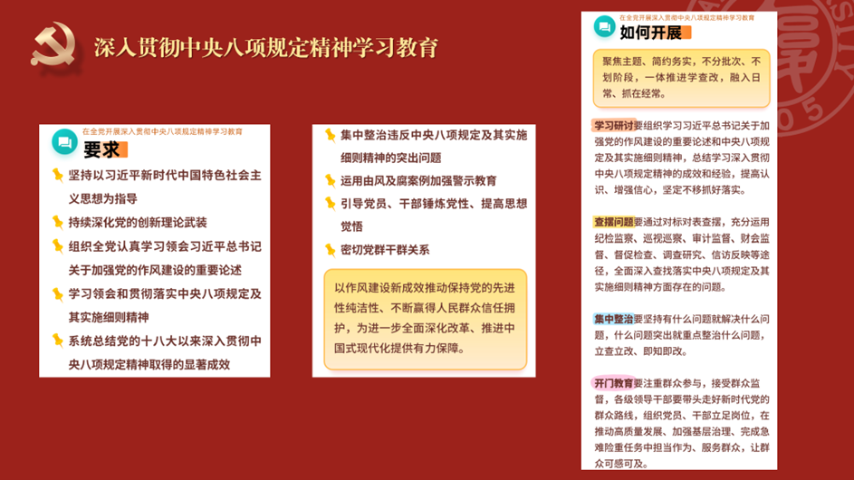 2025年3月12日,中央党的建设工作领导小组召开会议指出,党中央决定,自2025年全国两会后至7月在全党开展深入贯彻中央八项规定精神学习教育。这是巩固深化主题教育和党纪学习教育成果、纵深推进全面从严治党的重要举措,是密切党群干群关系、巩固党的执政基础的必然要求,是推进中国式现代化的有力保障。根据党中央、学校党委要求,肉漫画 研究生党支部于2025年4月开展组织生活,进行系列学习,对研究生党员的作风规范进行了有效落实。