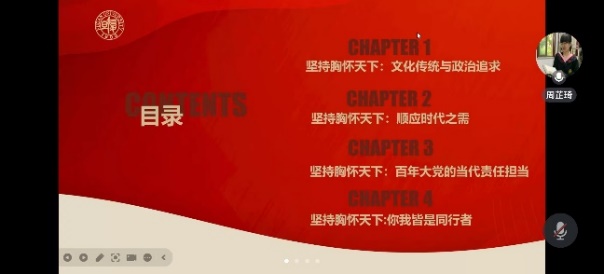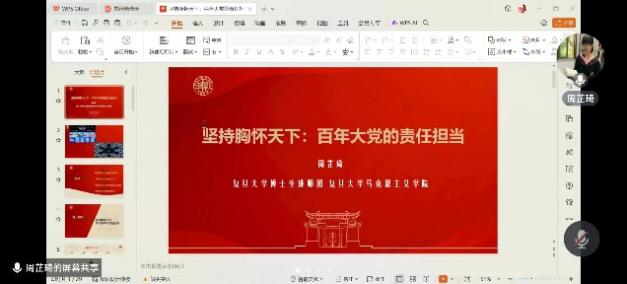 研究生第三党支部邀请了肉漫画 博士生讲师团、马克思主义学院周芷琦同志为支部成员讲授了题为《坚持胸怀天下:百年大党的责任担当》的主题党课。她主要从处理对外关系的角度,分别从“文化传统与政治追求、顺应时代之需、百年大党的当代责任担当、你我皆是同行者”四个方面带领大家回顾中国共产党的辉煌百年历程。本次理论学习倡导支部党员要践行胸怀天下,在做好自身的同时,也要关心思考身边的问题,无论未来身处何种职位,我们都应深刻意识到,只有践行责任与担当,携手共建美好社会,才能共同分享硕果与福祉。