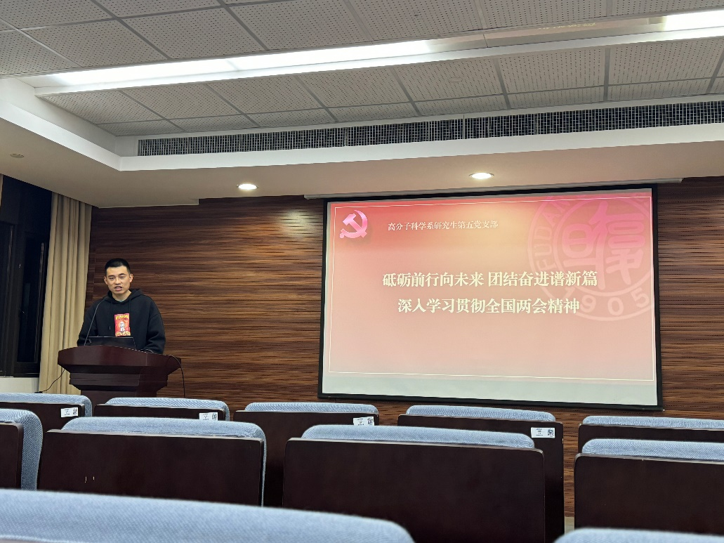研究生第五党支部围绕“砥砺前行向未来,团结奋进谱新篇——深入学习贯彻全国两会精神”开展了理论学习,集体学习了中共中央印发的《党史学习教育工作条例》。“高质量发展是全面建设社会主义现代化国家的首要任务。”支部着重学习了习近平总书记在参加江苏代表团审议时的重要讲话精神,并请党员结合自身科研实事,从多个方向对“新质生产力”进行了讨论,鼓舞大家在科研工作中脚踏实地,奋勇争先,以青春之美种植成果之实。