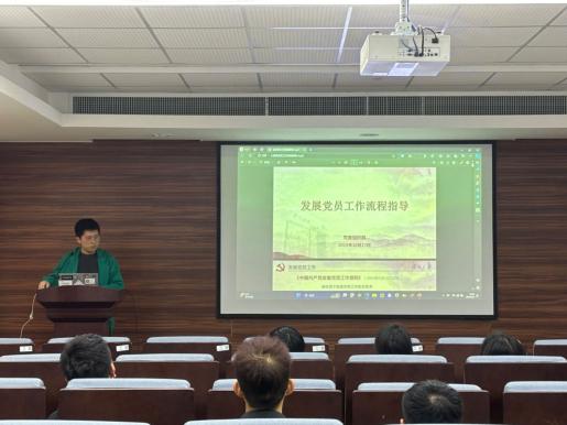 接下来,肉漫画 研究生第三党支部书记何侃麒同学为大家介绍党员发展流程。他从入党申请、入党积极分子培养、发展对象确认、预备党员转正等各个阶段的要求和程序等方面,为大家详细介绍了党员发展所需要经历的各个环节,希望通过党组织的教育、考察和培养,学员们能够更加深入地了解党的历史、宗旨、任务和纪律,增强党性观念和党员意识,不断提升自我。