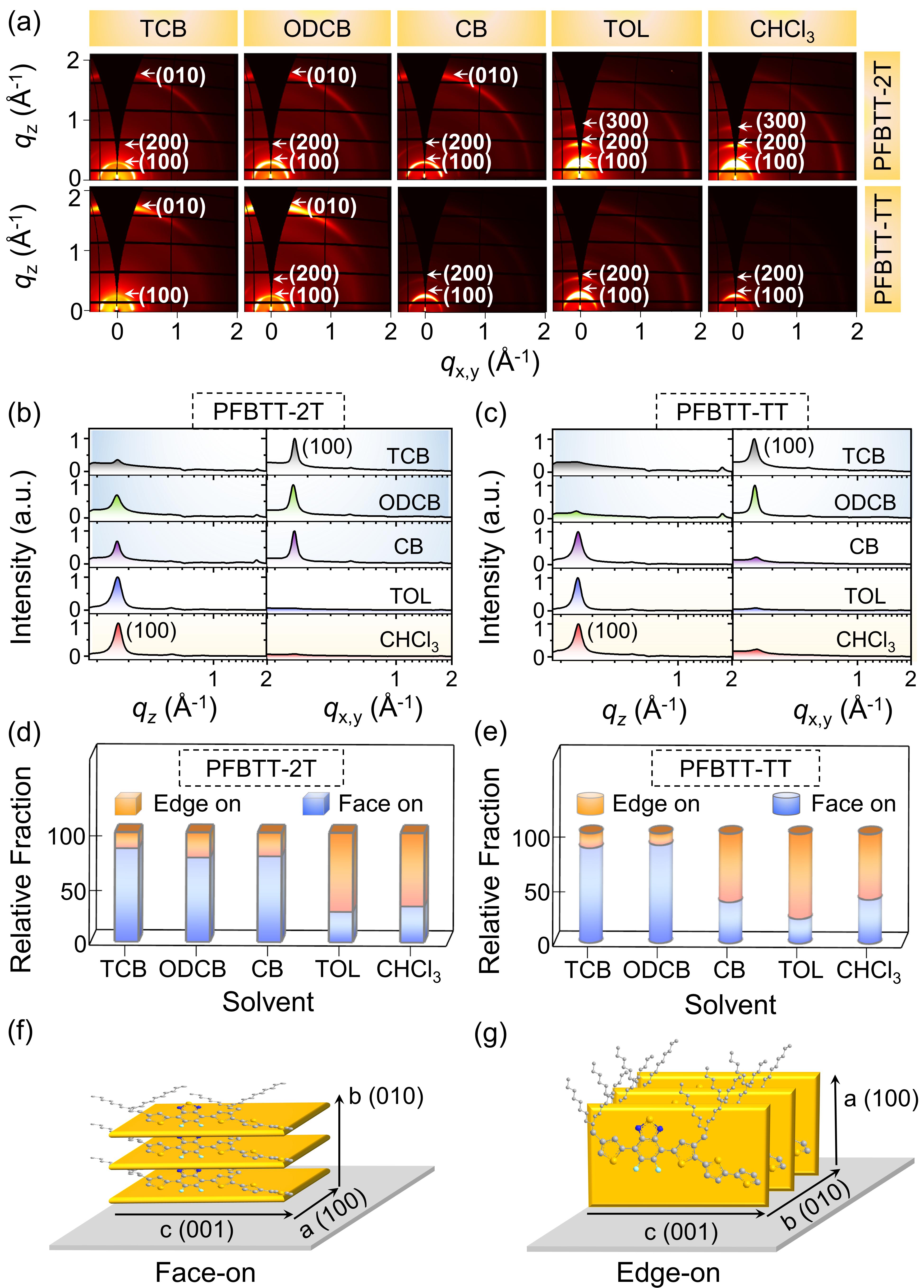 图3. PFBTT-2T和PFBTT-TT通过不同溶剂形成的薄膜2D-GIWAXS图、结晶参数分析以及PFBTT-2T薄膜的结晶取向示意图。