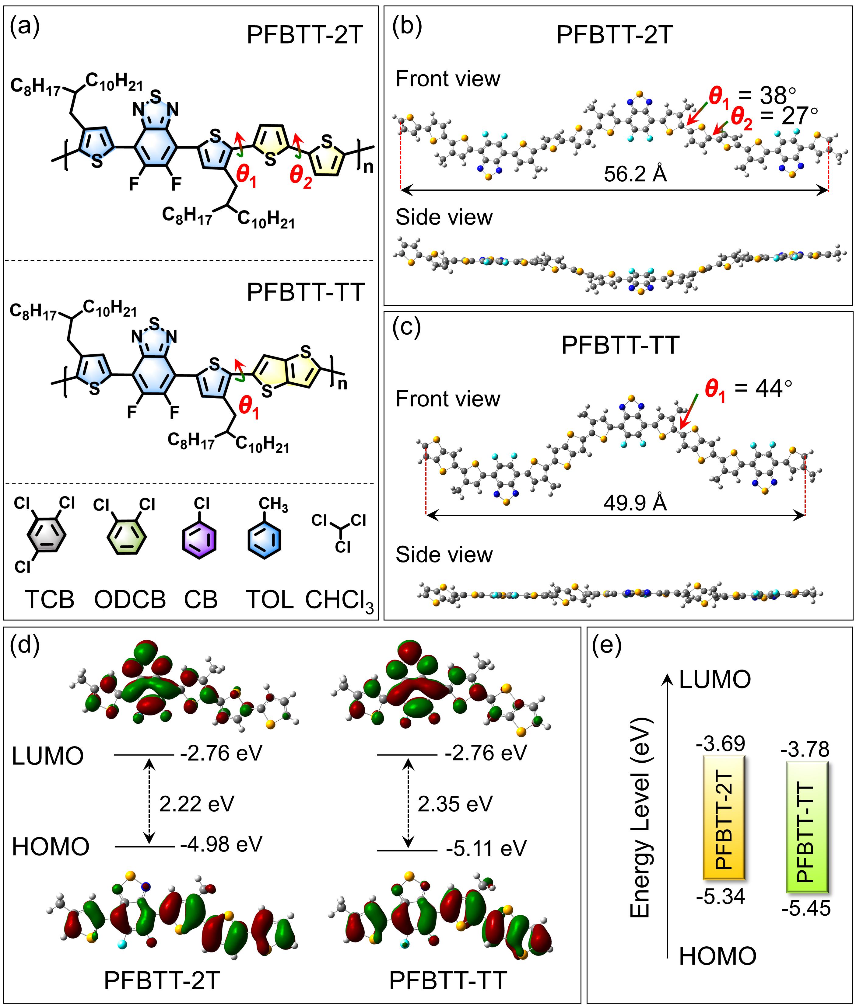 图1.PFBTT-2T和PFBTT-TT的化学结构、分子构型、HOMO/LUMO轨道以及能级图。