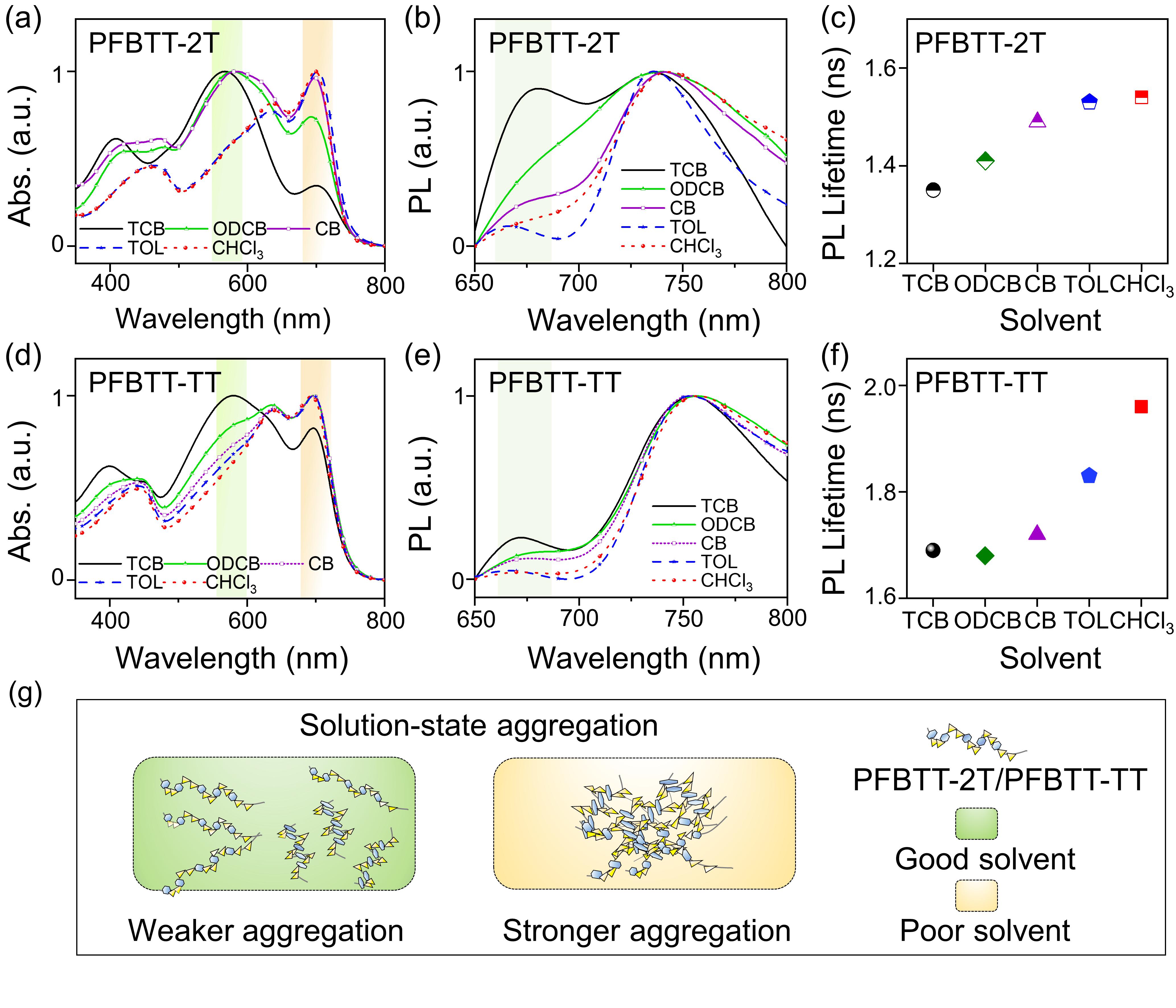 图2.PFBTT-2T和PFBTT-TT在五种不同溶剂(TCB、ODCB、CB、TOL和CHCl3)中的紫外吸收光谱、荧光光谱及寿命以及溶液态聚集示意图。