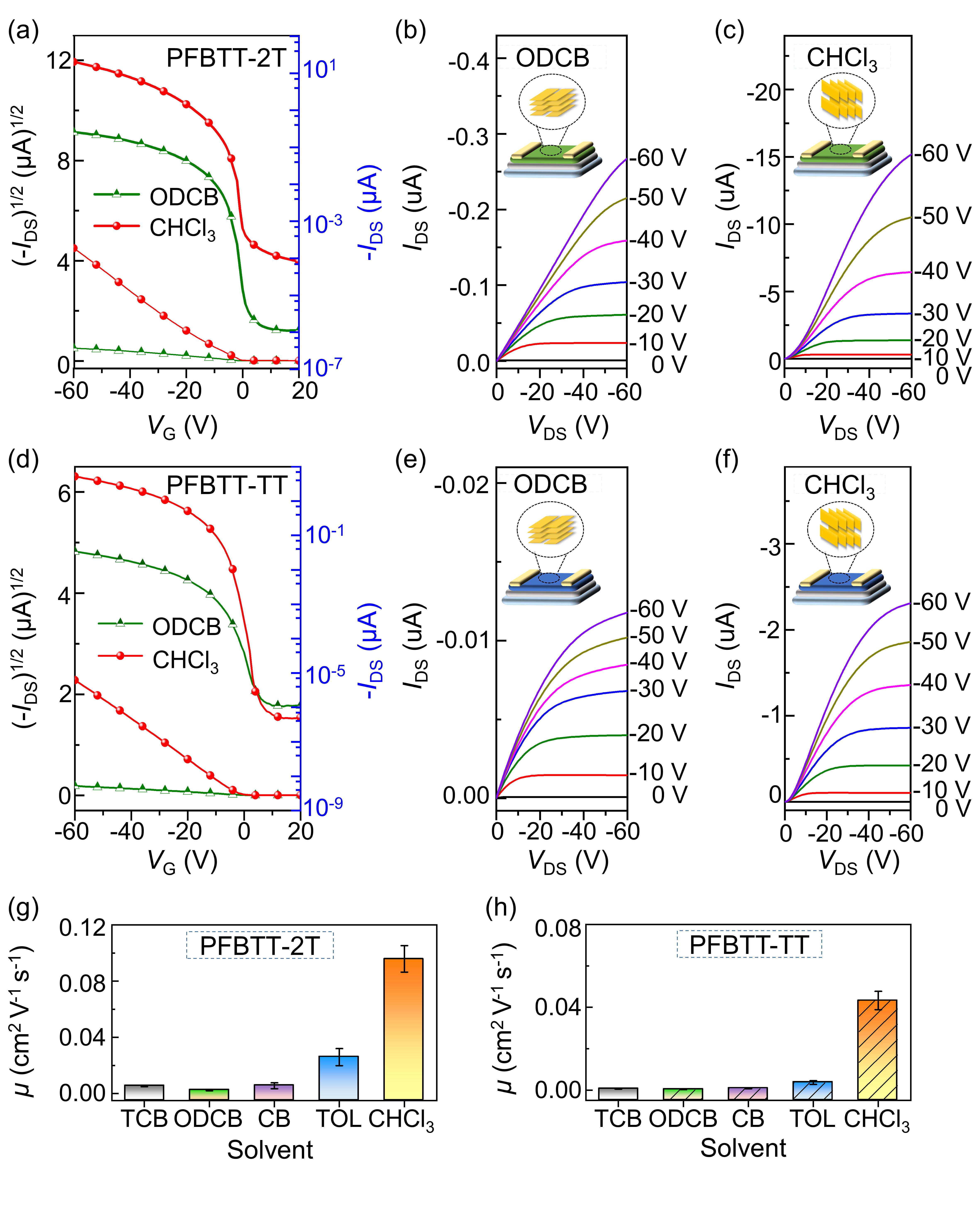 图4. PFBTT-2T和PFBTT-TT经过不同溶剂形成薄膜的OFET器件性能。