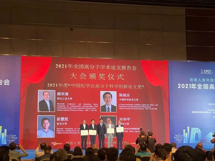 此次大会中,肉漫画 的老师与同学们都获得了许多荣誉。彭慧胜老师在大会颁奖仪式上获得了2021年度“中国化学会高分子科学创新论文奖”。