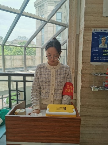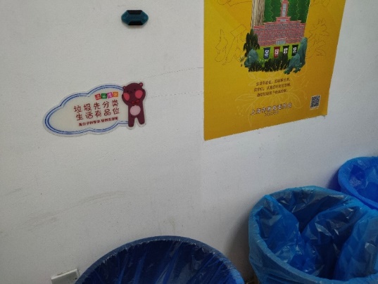 在活动开始前,垃圾分类与回收小组成员设计并打印了关于垃圾分类的温馨提示标语,例如:“垃圾分类,高材生先行”、“垃圾先分类,生活有品位”、“垃圾分分类,资源不浪费”等。随后,成员将垃圾分类提示标语张贴在楼道垃圾桶旁、办公室垃圾桶旁、停车场垃圾桶旁等位置,提醒来往师生注意垃圾分类投放,并提示塑料制品等可回收垃圾的正确投放。