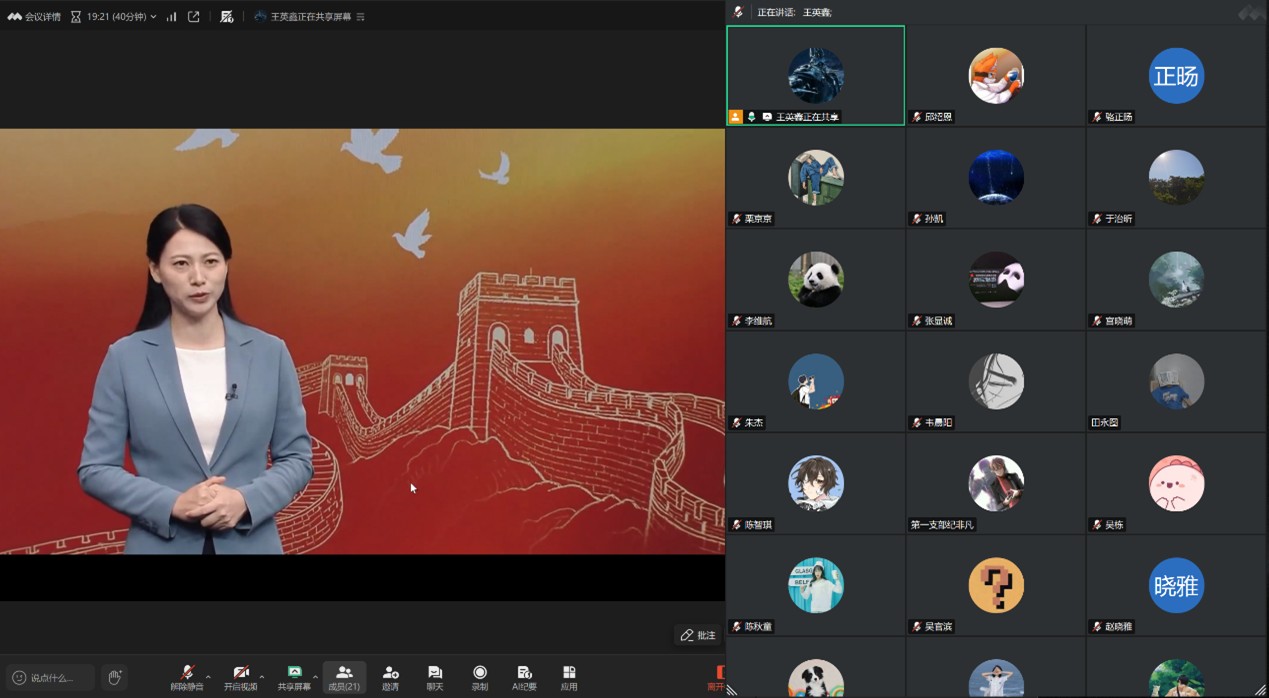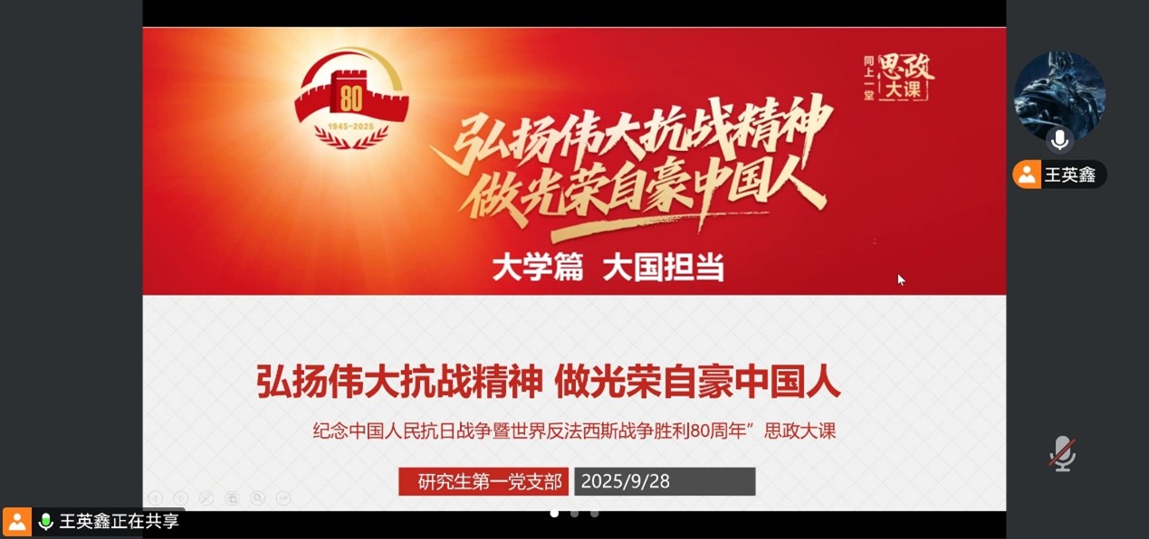 9月28日晚上,研究生第一党支部通过线上平台开展思政大课学习活动,支部副书记王英鑫主持本次会议,支部全体党员参加学习。全体党员重温了中国人民抗日战争那段波澜壮阔的历史。课程内容深入浅出,通过丰富的历史资料和生动的案例,展现了中国人民抗日战争的艰辛历程和伟大意义。课程再现了历史的厚重与价值,回答了是谁高举抗战旗帜,成为全民族抗战的中流砥柱这一根本问题。通过学习,党员们更加清晰地认识到“中国共产党捍卫民族独立最坚定,维护民族利益最坚决,反抗外来侵略最勇敢”。民族生死存亡之际,许多革命先烈舍小家、为大家的感人故事深深触动了每个在场党员的心。