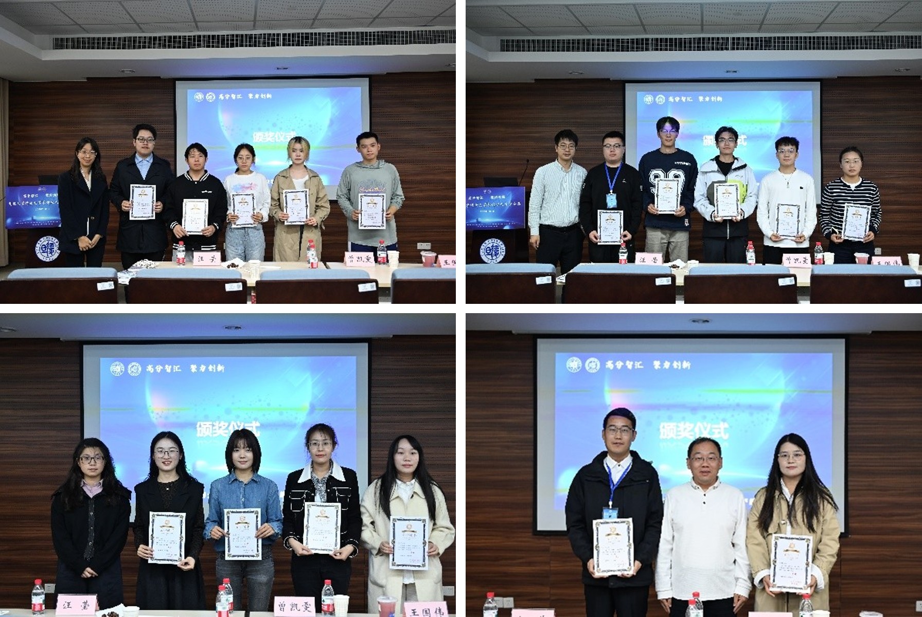 论坛汇报结束后,评审老师们对各位汇报人的口头报告进行打分,评选出一、二、三等奖。最后进入颁奖环节,贺倩如、曾凯雯、汪莹和王国伟四位老师分别为获得优秀墙报奖和口头汇报优秀奖的同学们颁发荣誉证书,并合影留念。