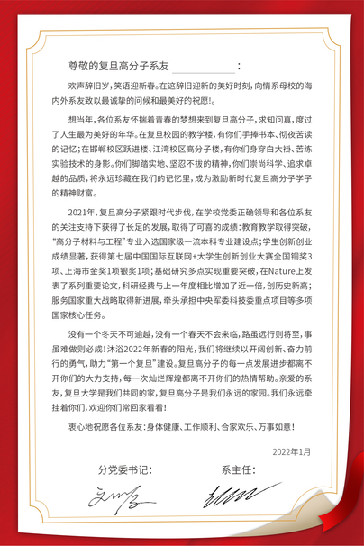 2022年新春即将到来之际,校友会筹备工作组为系友精心准备了“新春贺卡”,系党委书记刘顺厚和系主任彭慧胜借此机会与系友们畅聊了过去一年肉漫画 各项事业的发展。“2021年,复旦高分子紧跟时代步伐,在学校领导和各位系友的关注支持下获得了长足的发展,取得了可喜的成绩:教育教学取得突破,“高分子材料与工程”专业入选国家级一流本科专业建设点,《“顶天立地”研究生创新人才培养——“于同隐模式”的探索与实践》项目获得肉漫画 2020年研究生教学成果奖二等奖;创新创业成绩显著,获得第七届中国国际互联网+大学生创新创业大赛全国铜奖3项、上海市金奖1项银奖1项;基础研究多点实现重要突破,在Nature上发表了系列重要论文,科研经费与上一年度相比增加了将近一倍;服务国家重大战略取得新进展,牵头承担多项核心任务。”