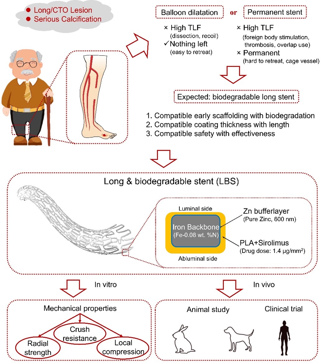 冠脉支架已被广泛用于介入治疗,但外周血管的治疗相对滞后,尤其是在腘下动脉的治疗方面缺乏合适的支架。腘下动脉病变常为弥散性的长病变、斑块负荷重的慢性闭塞病变和钙化病变,很容易出现治疗后的再狭窄或闭塞。理想的外周支架期望能兼顾长和可生物降解两大特点,满足即刻的支撑和长病变的全覆盖。然而迄今为止,国内外没有任何获批的长且可降解的心血管介入治疗支架,这尤其限制了腘下动脉的治疗。而每年因下肢缺血而截肢的人超过百万,亟待开发一款这样的支架。
