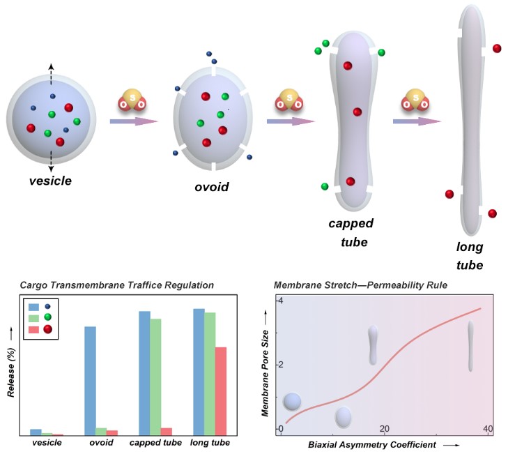 通过对SO2响应的分子机理和聚合物自组装相变规律进行详细研究发现,通过“吸入”SO2气体,聚合物侧链上花菁结构的微小变化会引起膜组装驱动力的巨大转变,从π-π相互作用逐渐转变为氢键相互作用,诱导囊泡膜发生轴向拉伸,逐步变形为管状体。在这一SO2气体塑形过程中,研究人员发现单一囊泡对SO2气体的呼吸深度(SO2浓度)可以良好控制膜的延展程度,而这种膜的弹性反过来又能决定膜选择透过性的动态变化。因而通过预先设定SO2刺激程序编辑聚合物囊泡的变形动力学过程,可以实现膜表面纳米孔洞尺寸的连续扩大,从而根据膜内负载物的分子尺寸管理多种货物的选择性跨膜交换过程。