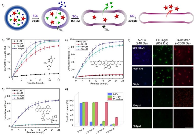 图2. SO2浓度调控的聚合物囊泡膜选择透过性与多重负载物质的跨膜输运