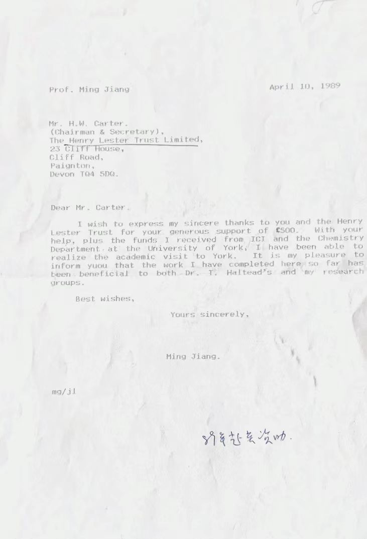 这意外的好消息自然使我非常欣喜,但我也觉得有些不解。专业性的如中英合作基金组织这样的机构都表示无能为力,而这个鲜为人知的Lester Trust却能慷慨解囊呢?我记得后来问过Tom这Trust 是怎么回事,他说也不晓得,只听说这和一个与中国渊源很深的人有关。他说为申请这个基金他多次与这个Trust打电话和通讯,直觉是,在那个office里只有一位老人,在使用一台老式机械打字机工作着(在英国,那时电子打字机已经普及),听上去真有点神秘感。有了这份资助为基础,再加上后来得到的从ICI②及York大学化学系的资助,我的飞机票、食宿、仪器使用、药品等费用都能解决了。于是我在1989年2月到了York,开始了为期两个月的来之不易的合作研究。研究获得了较预期更好的结果。