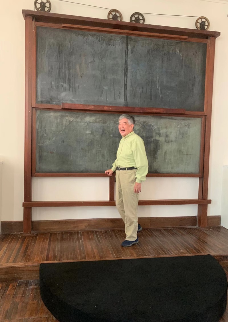 访谈结束,我们一起参观了修缮后的雷士德工学院。我很荣幸地享用了当年校长专用的仅容一人的“迷你”电梯。走进保留完好修旧如旧的教室,见到带有轴轮的提拉式的黑板,立即忆起1955年我刚进肉漫画 求学时第一次见到这种黑板时的新奇,亲切之感油然而生,禁不住兴奋起来。