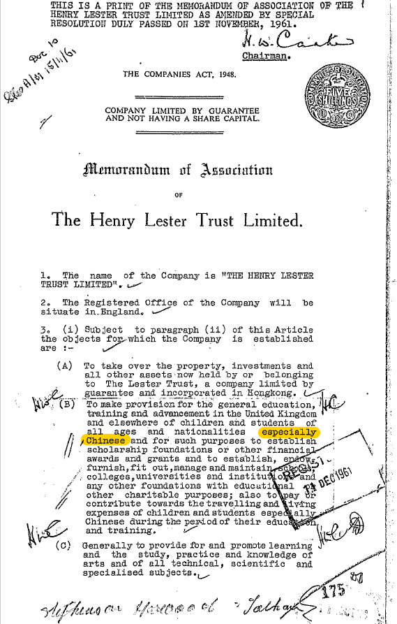 1949年,Henry Lester Trust在上海黯然落幕,房芸芳的传记的叙事自然也到此为止了。作为新一代的Lester Boy,我抑制不住自己了解后续故事的渴望。于是我自己,同时也邀请海外的朋友和学生们一起做了网上调研,很有收获。英国政府网站上的资料显示,雷士德基金会总部首先从上海迁移到了香港,其后于1957年在London申请注册。我们可以看到申请报告和章程的全文。章程表明它的主要宗旨和职能是“为英国和其他地方所有年龄和国籍的儿童和学生的普通教育、培训和发展做出支持,并以此为目的建立奖学金基金会……”;但是该章程没有提到雷士德遗嘱特意关照的捐献用于中国。然而仅4年后,1961年,基金会董事会专门召开会议,并做了一个重要决议,把基金会章程里面规定的基金使用的对象中,特别地加上了‘especially Chinese’。这表明基金会在1961年恢复了雷士德遗嘱的本意,奖学金为中国而设。这一戏剧性变化的背景我们不得而知。我们还查阅到雷士德基金近期的资料,目前拥有资金大概是100多万英镑,每年收入有几万英镑。每年资助20-30人,共6-7万英镑。例如,2021年资助28人,共69002英镑。所以总的印象是,很幸运,基金会还在,但规模已是很小了。
