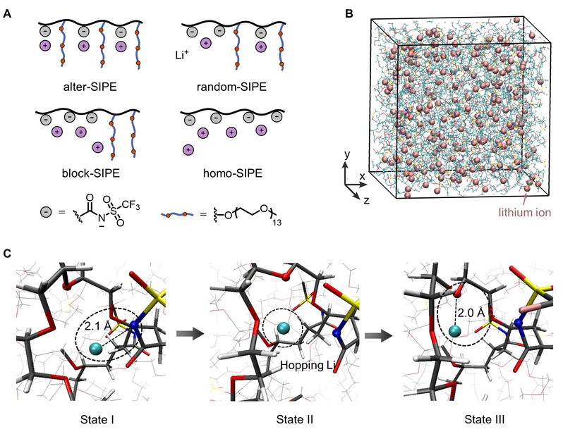 2. A) 不同序列结构的单锂离子导电聚合物电解质示意图;B) 交替序列结构的单锂离子导电聚合物电解质的分子动力学模拟图;C) 交替序列促进锂离子连续跳跃迁移的路径示意图