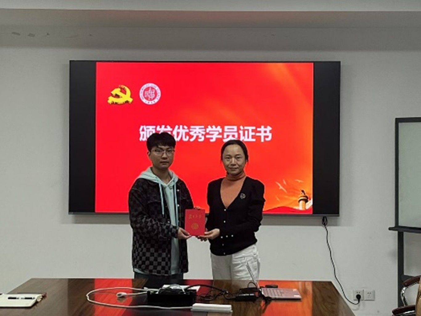 首先衣芳慧宣读了此次培训班结业名单,9位学员顺利通过各个环节考核,顺利结业。研工组长黄晔为评选出的优秀学员颁发荣誉证书,吴冰洁同学在培训班学习阶段成绩优异,表现突出,被评为优秀学员。在他的优秀经验分享中,他提到要牢记使命和担当,认真科研,将学术科研与国家发展相结合,做好接力棒,为中华民族伟大复兴贡献力量。