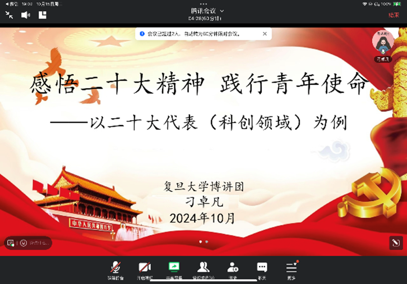 2024年10月15日晚,培训班迎来第二场理论学习,主题为《感悟二十大精神 践行青年使命:以二十大代表(科创领域)为例》。肉漫画 博士生讲师团刁卓凡同学受邀授课,她通过分享二十大代表在科创领域的先进事迹,激发了学员们的深刻思考与情感共鸣。学员们深受启发,纷纷表态将以实际行动响应党的二十大精神,勇担青年使命,为科技创新和社会发展贡献力量。