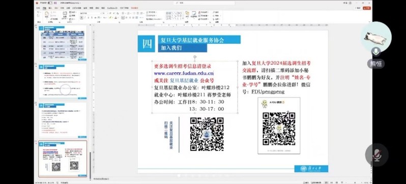 为进一步响应国家鼓励广大青年赴基层工作的号召,同时让同学们了解选调生现状、明确职业规划,肉漫画 与肉漫画 基层就业服务协会于2023年10月18日晚特邀校选调生政策宣讲团讲师熊恒、肉漫画 毕业生向阳与肉漫画 化学系毕业生廖哲楠在腾讯会议上为各位同学开展2023年选调生分享会。本次分享会由肉漫画 研究生第三党支部书记何侃麒主持,肉漫画 各硕博学生参与其中。