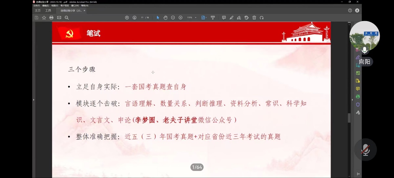 本系2023届硕士毕业生向阳同学主要介绍选择与考试环节。他结合自身经历,从“识内、辩外、破题、坚守、祝愿”几个方面,给同学们细致地讲解了具体如何结合自身意愿选择工作地点,分享了笔试、面试的备考经验,鼓励同学们积极备考,他也指出同学们要正确看待选调生工作,这不仅是一份职业,更是一份事业,要认识自己、着眼现实、放眼未来。