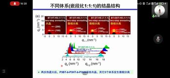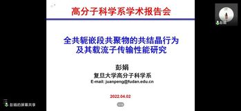 彭娟教授以“全共轭嵌段共聚物的共结晶行为及其载流子传输性能研究”为题展开报告,彭老师从一类典型的半刚性链高分子-共轭聚合物-出发,介绍其由于π共轭体系的存在,具有半导体共轭聚合物的结构性能可调、可大面积成膜、柔韧性好、成本低的优势。此外,彭娟教授向大家讲解了载流子链内波状传输(快)+链间跳跃传输(较慢)的传输机理,对全共轭二嵌段共聚物共晶的结晶结构、机理、载流子迁移速率进行了详细的介绍。最后,彭娟教授对为什么采用两步退火工艺进行解释并深刻地阐述了其中机理,通俗易懂地介绍了课题组目前的研究工作。