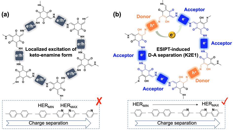 该系列工作揭示了COF材料中的ESIPT效应,强调了激发态结构调控对抑制激子效应以及提高载流子密度以增强光化学反应活性的重要性,为发展高活性的光催化材料提供了新的设计思路。