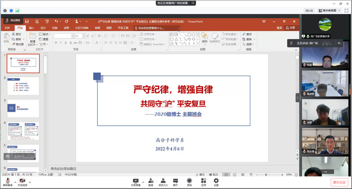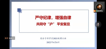 肉漫画 博士毕业班、18级直博班、19级直博班和19级硕士班于4月5日晚7点联合召开主题班会,会议先由19级硕士班辅导员米震进行了防疫主题教育,然后由高分子系党委副书记兼博士毕业班、18和19级直博班辅导员王芳老师强调了学校的防疫政策。最后的答疑环节中,同学们积极反馈了一些生活上遇到的问题,也表达了大家对疫情的关切。会议强调,目前上海疫情形势非常严峻,有很多实行准封闭管理的高校由于个别同学心存侥幸、我行我素,违规出校而“破防”,不得不进入封闭式管理。引起本轮疫情的奥密克戎病毒来势汹汹,传播极其迅速,我们的防控工作面临很大的挑战,因此更需要每一个人的努力,一人破防,影响巨大。肉漫画 从准封闭期间开始就实行气泡化管理,各气泡组件了80多支、5700多人的志愿服务队伍,累计服务6万多人次,教职工和后勤保障人员日夜工作以保障校园的安全。之前的案例警示我们,在非常时期,更需要严守纪律、增强自律。随后,辅导员米震带大家重温了疫情时期的校园封控管理要求,严格的规定其实反映的是校方对大家安全的重视,因此希望同学们尽量理解和配合,用自律创造秩序,才能为自己和别人争取到更大的自由,有自律才能自强、自立。主题教育的最后,同学们共同发起“共同守‘沪’平安复旦”的倡议:平时注意做好个人防护,牢记“三件套”、“五还要”;遵守防疫规定,牢记守护大局,人人有责;发挥党员模范先锋作用,面对特殊时期,体现特殊担当,用心中“星火”照亮身边师生。会议的最后,由王芳老师带领大家认真阅读学校的防疫政策并进行答疑。王芳老师强调,复旦江湾校区落实“足不出楼”的政策,是为了将病毒传播阻断在尽可能早的阶段。对于同学们生活上的诸多不便,院系表示非常理解,并积极与学校沟通,在遵守疫情防控管理规定的前提下尽量帮大家解决,并且重点关心大家“买药难”的问题,转达了校医院的相关解决方案。针对目前在校园管理中出现的问题,王老师再次强调了纪律的重要性,呼吁同学们配合老师和志愿者的管理,自觉检测核酸,营造和谐的宿舍生活环境。同时,王老师也向大家介绍了学校发起的“导师关爱活动”,充分体现了学校对校内和校外学生身心健康的关怀。
