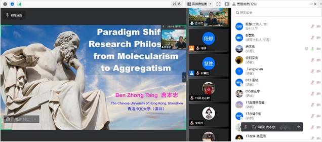为加强校际学术交流,拓宽同学们的科研视野,肉漫画 于2022年4月12日线上举办了第六场聚合讲坛特邀学术报告。本次报告邀请了中国科学院院士、香港中文大学(深圳)理工学院院长唐本忠教授,作主题为《从分子论向聚集体论的研究范式转移》的报告,报告由系主任彭慧胜教授主持。