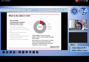 《自然》是世界上历史悠久的、最有名望的科学杂志之一,首版于1869年11月4日,作为知名科学期刊的编辑似乎充满了神秘感,Hansell 博士此次报告中为大家介绍了编辑的相关工作内容。首先编辑的工作内容包括预筛选、选择同行审稿人、审稿后决定、邀约综述等稿件、写短文和 Highlight、制定编辑标准政策等。在她的工作过程中,经统计一年会收到约450篇投稿论文,其中有 8%-10% 的文章会被接收。
