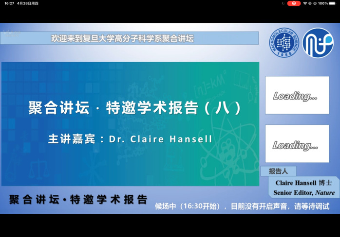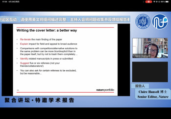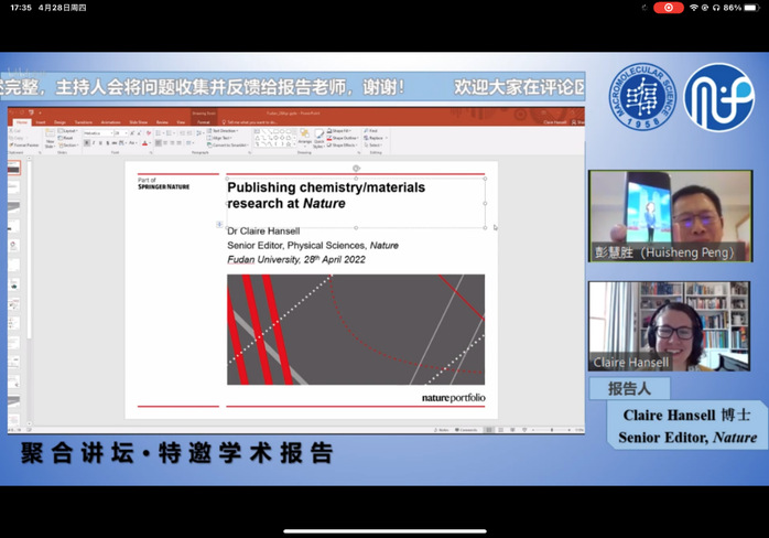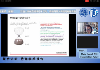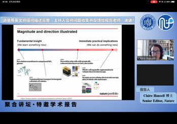 为加强学术文化交流,拓展同学们的科研视野,肉漫画 特邀了《自然》杂志资深编辑 Claire Hansell 博士于4月28日下午16:30举办了《Publishing Chemistry/Materials Research at Nature》的精彩报告。本次报告由肉漫画 系主任彭慧胜教授主持。