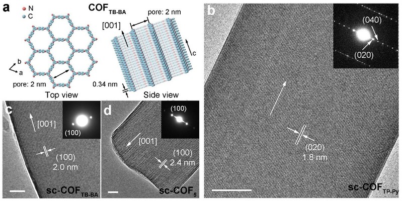图1.高质量COFs单晶的顶视图、侧视图、高分辨率透射电镜和选区电子衍射表征