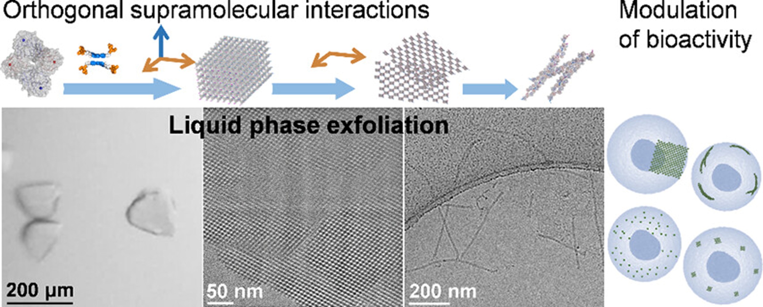通过设计具有正交超分子作用力的新型配体,本研究实现了对蛋白质母晶体层间相互作用的精准调控。配体通过面内的蛋白质-碳水化合物相互作用和面外的π–π堆叠作用力,使ConA晶体形成高度多孔的三维结构,并通过溶液选择性地破坏层间作用力,生成包括二维大尺寸纳米片和一维纤维在内的多种形貌结构。剥离得到的二维纳米片的尺寸达到微米级,是传统自组装纳米片的数十倍,并保留了晶体的精确层状结构。