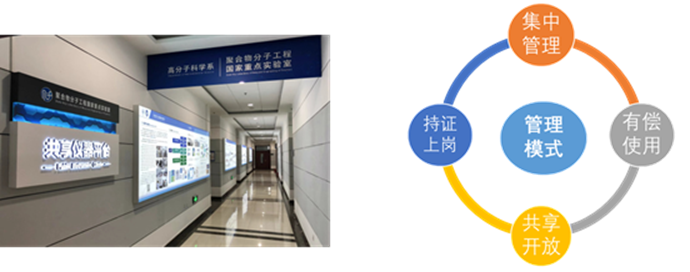 共享仪器平台目前拥有各种大型仪器设备总计55台(组),总价值超1亿元。共享仪器分为三大系统,八个子平台(见图2),功能涵盖高分子材料成型加工及性能测试、高分子的分子量测试及结构分析、微观形貌观察、分离纯化、生物医学检测以及微加工等。所有仪器设备均采取“集中管理、共享开放、持证上岗、有偿使用”的管理模式(见图3),配备专职的实验技术人员进行管理与服务,建立健全了各项规章制度,保证了设备的完好率和利用率,仪器整体运转状况良好。