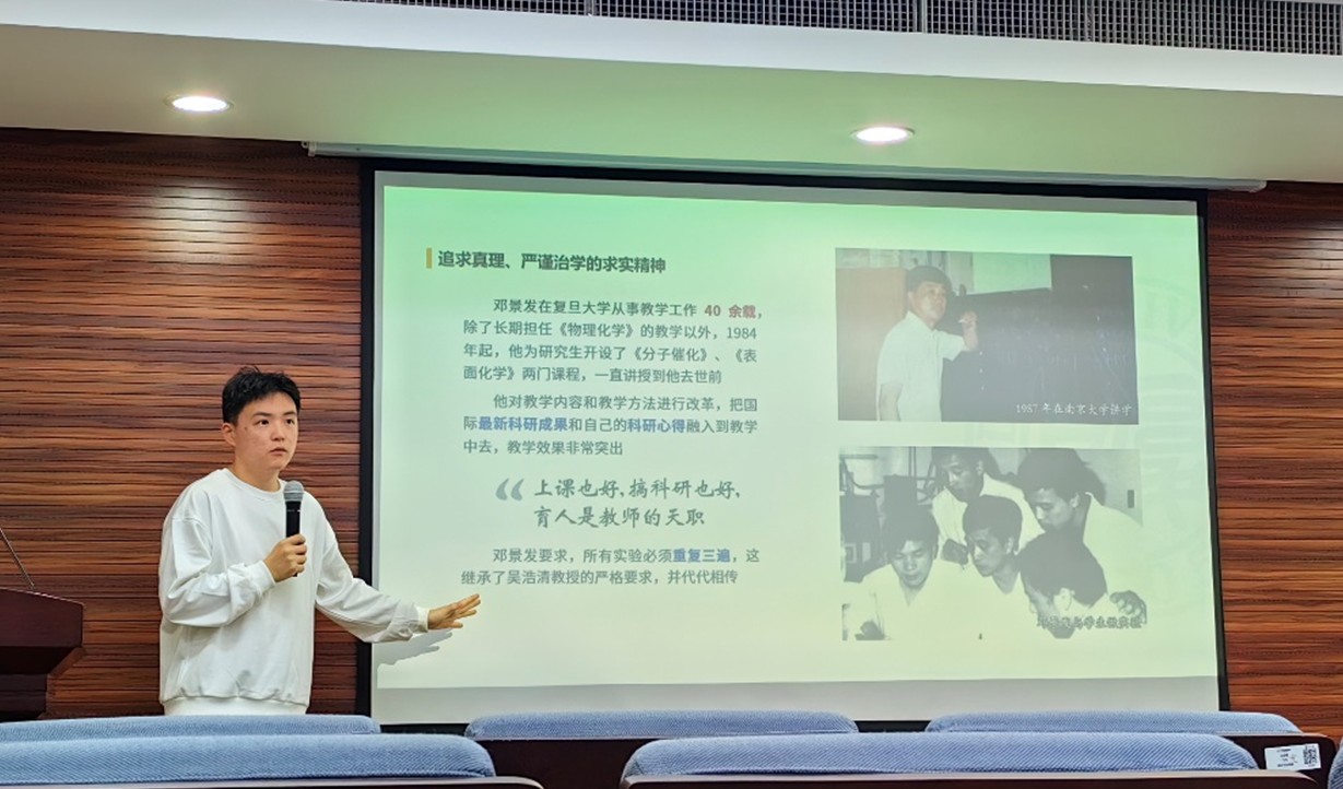 研究生第三党支部邀请博士生讲师团范文斌同学为支部成员主讲课程—“邓景发—生命之火照亮远方的路”。 邓景发教授先后在同济大学和肉漫画 接受教育并留校工作,为肉漫画 化学系建立了表面化学和催化实验室,并于1995年当选为中科院院士。他的成长经历充满艰辛,母亲在困境中教育他要勤奋读书,成为对国家有用的人。尽管他的科研项目为国家创造了显著的经济效益,但邓老师始终认为知识和科学技术的贡献才是真正的财富。在90年代面对留学热潮时,他始终关心国家发展,认为优秀学生应为国家贡献力量,体现了强烈的社会责任感和爱国精神。这种淡泊名利、潜心研究的科学追求令在场的同学们为之感慨,激励大家踔厉奋发。