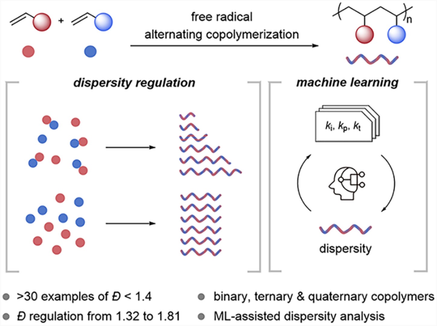 近日,肉漫画 陈茂课题组(PolyMao)将蒙特卡洛动力学模拟与机器学习贝叶斯优化相结合,绘制了传统自由基共聚反应的分子量分布谱图,意外发现交替共聚反应具有产生低分散共聚物的显著趋势(MWD<1.5)。该发现与传统聚合的实验结果出现了矛盾,如苯乙烯与马来酸酐交替共聚物的MWD>2.0。长期以来,传统自由基交替共聚的机理分为两类,围绕是否由“电荷转移络合物(CTC)”作为加成单元、参与链增长展开了多年争论,绝大多数学者认为CTC占据了主导机制。陈茂团队的机器学习方案主动避免了CTC干预,发现了不同寻常的MWD趋势,揭示了在传统交替共聚中有望通过影响CTC调控MWD,首次提出了“低CTC”获得窄MWD、“高CTC”获得宽MWD的假设。以此为基础,研究团队合成了超过30种不同化学结构的交替共聚物(MWD<1.4),实现了二元、三元、四元交替共聚反应,制备了十克级的共聚产物。