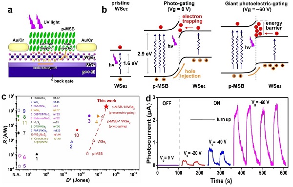 图a. 器件示意图和光照下光生载流子的捕获过程;图b. 光照下WSe2(左图)、普通光栅作用下异质结(中间)和“巨光电栅效应”作用下异质结(右图)的能带结构示意图;图c, “巨光电栅效应”作用下器件性能和文献报道数据的对比; 图d. 电栅开关光电探测器在不同栅压下的光电流响应。