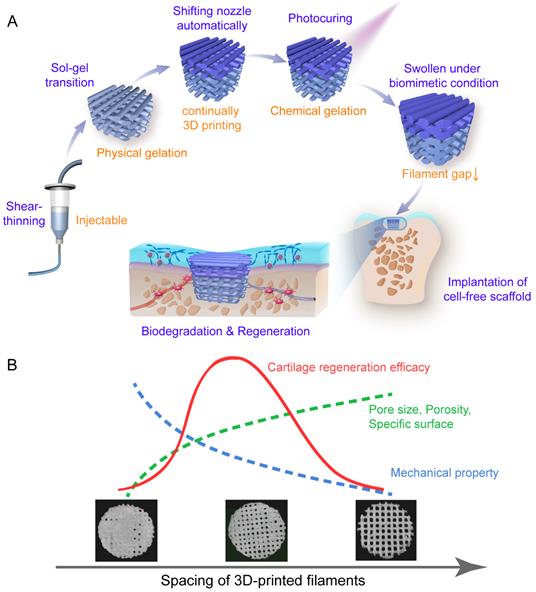 丁建东团队运用了其所化学改性的明胶大单体gelMA水体系随温度降低呈现sol-gel转变之间的特征,并提出了“初生凝胶”的概念,即,在合适的改性程度、浓度、温度条件下,刚低于相转变点所形成的水凝胶具有显著的非牛顿流体行为,呈现强烈的剪切变稀和自修复能力,由此解决了挤出成型中方便挤出和保持塑型的两难问题,进一步将物理凝胶化和化学凝胶化相结合,获得了较为理想的交联明胶GelMA水凝胶多孔支架。调节3D打印的梁间距,制备了一系列双层多孔水凝胶支架。综合结合支架的力学性能、体外细胞迁移和增殖实验以及体内的兔关节软骨-软骨下骨的再生修复。研究发现在溶胀的水凝胶支架中,中等合适的孔隙能保证细胞的充分迁移、营养的充分输送并且提供必要的力学性能。优化条件下再生的关节软骨的微观结构呈现正常的组织学形态。