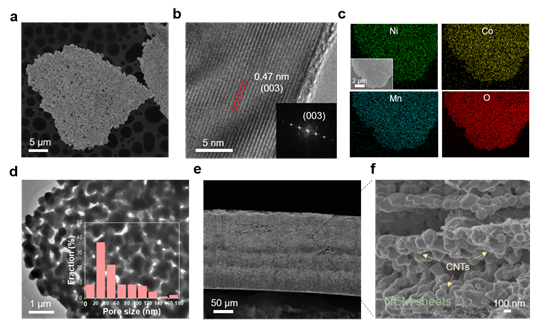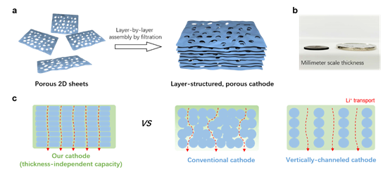 提出了多种二维多孔片的通用制备策略,以主流正极材料三元镍钴锰为例,利用葡萄糖辅助的方法,合成二维多孔片,与碳管共混后层层组装成膜,得到自支撑电极片。在该体系中,实现高载量、低孔隙率的同时,片内的孔贯穿整个电极,实现了通畅的离子传输,同时,碳管的交织网络保证完善的电子传导。
