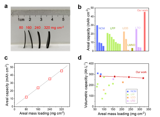 实现超厚电极的构建,面积负载量最高达320 mg/cm2。随着负载量的增加,离子传输通道始终畅通无阻,活性物质克容量无明显衰减。最终,在38%的孔隙率下,最高面积容量达45.4 mAh/cm2