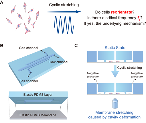 丁建东课题组以此PDMS微流控芯片为研究平台,验证了细胞在合适条件下有垂直于拉伸方向取向的特性。