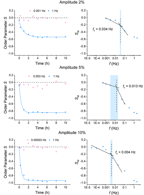 随后系统探究了人骨髓间充质干细胞(hMSC)在不同拉伸频率和幅度的循环拉伸作用下的细胞取向。在证实细胞取向存在临界拉伸幅度的同时,发现细胞取向具有临界响应频率(fc),且fc的值具有幅度依赖性,对于低幅度拉伸而言,需要更高的拉伸频率方能诱使细胞取向现象发生。