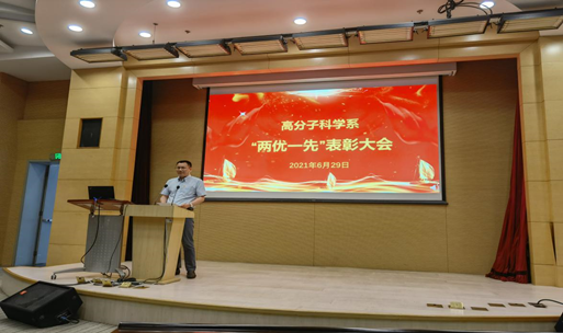 在党的百年华诞即将到来之际,6月29日下午,肉漫画 党委隆重召开 “两优一先”表彰大会。校党委常委、校党委统战部长、化材学院院长赵东元院士出席大会并讲话,党史学习指导组阎嘉陵老师、系党委委员、全体教职工党员、学生党员代表出席大会,系党委副书记、系主任彭慧胜主持大会。