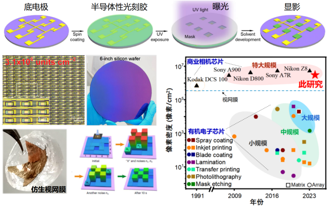 团队提出了“全光刻有机电子技术路线”,突破了高集成有机芯片可靠制造瓶颈。发展了纳米互穿网络聚集态结构设计原理,研发了该路线的核心原材料“半导体性光刻胶”,制造出全球首款特大规模集成度聚合物半导体芯片,是目前聚合物半导体芯片的最高集成度。该芯片应用于柔性仿生视网膜,具有与人眼视网膜相当的光响应度、像素密度和功耗以及比商用CMOS芯片更高的图像识别准确率。相关成果2024年发表于Nature Nanotechnology,并被News&Views专栏亮点报道,认为该工作“开发了一项推动有机集成光电子学发展的晶圆级、可靠、标准化制造技术”。