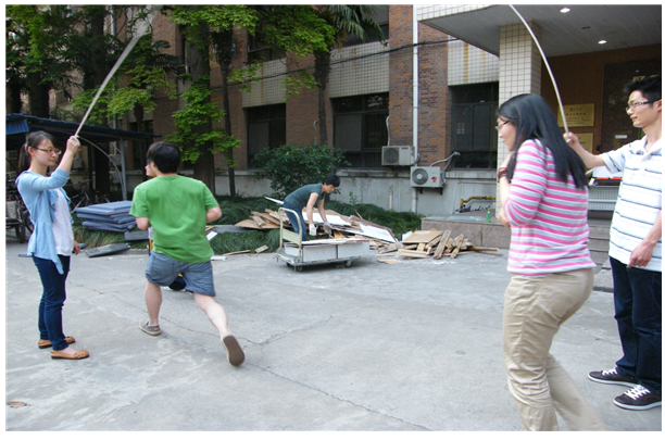 比赛4点整准时开始, 9只参赛队伍(以课题组为单位,9只代表队分别为杨玉良课题组代表队、武培怡队、姚萍-卢红斌联合队、胡建华队、王国伟队、邵正中队、刘天西队、丁建东队、本科生联队)分四组进行,由团学联主席郭辉同学计时,其他成员负责计数。开始时,同学们都颇为拘谨,动作也不娴熟,断绳现象屡见不鲜。随着比赛的进行,同学们掌握了要领,动作也越来越流畅。场内比赛热火朝天,场外加油声也气势如虹。个人赛在集体赛之后举行,王芳和包涵老师负责计时,团学联各成员负责计数,同学们都纷纷一试身手,挑战群雄。 5点30分,全部比赛结束。刘天西组代表队、姚萍-卢红斌联合队、武培怡组代表队分获集体赛的前三名。杨光等三名同学分获个人赛前三名。